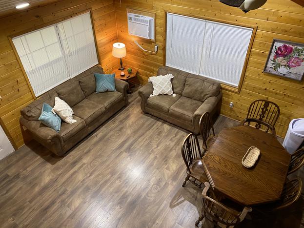 THE AFRAME - This fully furnished riverfront cabin will sleep up to 10, with master bedroom downstairs with a queen bed, upstairs (only accessible from outside) has 2 queen beds then the loft has one full. The living room has a sofa, a love seat, and a large futon (that can sleep two) along with a rock fireplace. The kitchen has a refrigerator, stove, and microwave, and a table that will seat six. This home comes with its own private river entrance with a BBQ pit and cement slab that will hold umbrellas. It also has a play house with a/c for kids and a fish cleaning station. There is an RV hookup (electric & water only) available on request for an additional charge of $50/per day.