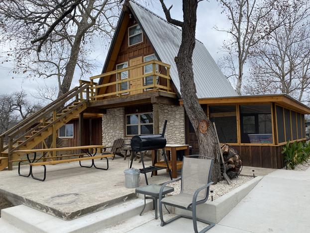 This brand-new-built TREETOP OASIS with its tropical feel, has views of the Nueces River and hills. The sunrises are amazing! The Oasis offers an abundance of outdoor living space. It has a large covered deck with chairs and a dining area to enjoy the view and the breeze, while the underneath area which boost a full bath, bar, kitchenette, swing, and an air conditioned play house for the kids, all for your enjoyment. Off to the side, you will find a BBQ pit and a fire pit area with chairs for cooking s'mores and to cozy up to on those cool Texas nights. The Oasis has a master bedroom with a queen bed, a loft with two queen beds, a full bath, kitchen, and living area. It has lots of glass so you can enjoy the view inside as well as out! This cabin has everything you need to enjoy your stay. The river is great for swimming, fishing, snorkeling, or kayaking. Bird watching, biking, hiking, and hunting are very popular in this area. Watching wildlife in the mornings or star gazing at night this place won't disappoint.